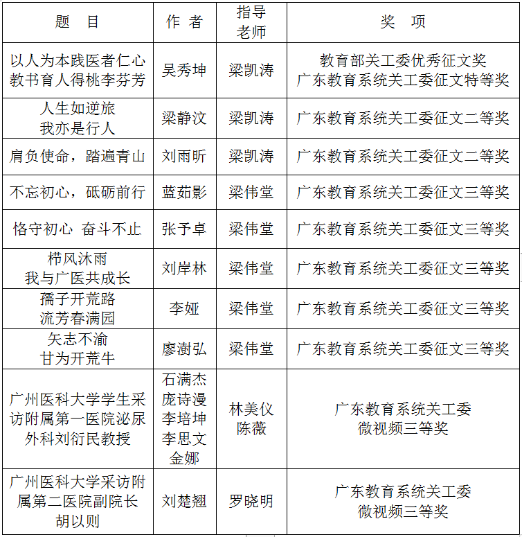 本网讯 近日,广东省教育系统关工委发布了《关于公布2023年开展“读懂中国”活动作品评审结果的通报》,广州医科大学报送的作品《以人为本践医者仁心,教书育人得桃李芬芳》荣获教育部关工委优秀征文奖和广东教育系统关工委征文特等奖;其他作品荣获广东教育系统关工委征文二等奖2篇、三等奖5篇以及微视频三等奖2个。
