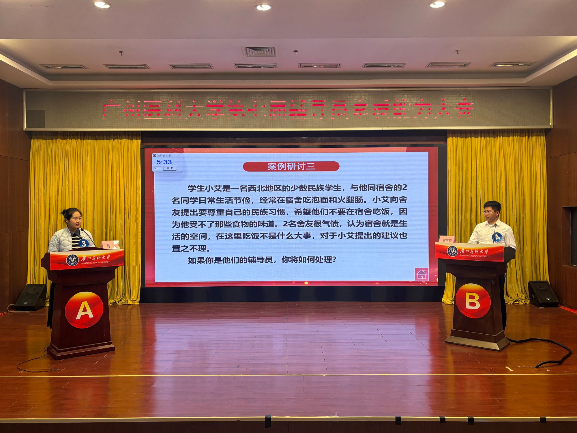 华南农业大学学生工作部部长赵凤、广东工业大学学生工作部部长许泽浩,我校学生工作部部长陈伟民、卫生管理学院党委书记凌坤、金域检验学院党总支书记曾王兴、学生工作部副部长叶稳安担任本次大赛评委。学生工作部全体干部以及全体辅导员来到现场观摩学习。大赛由第一临床学院学生科科长何少群主持。