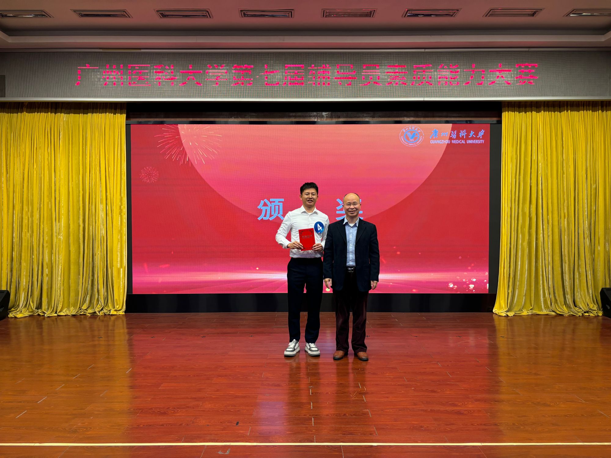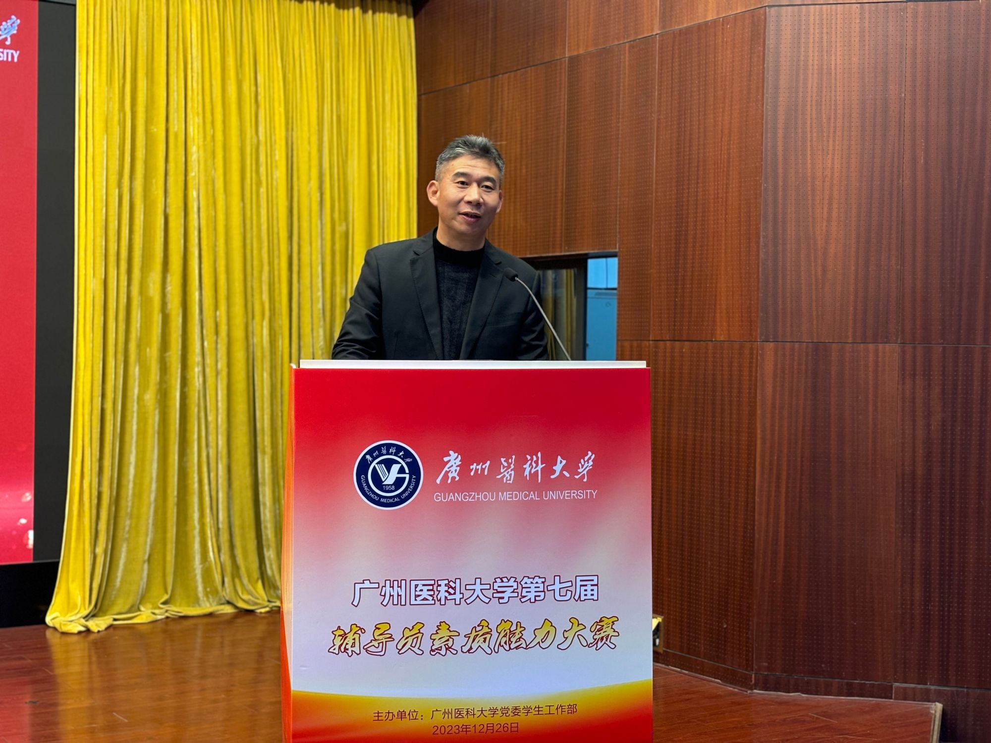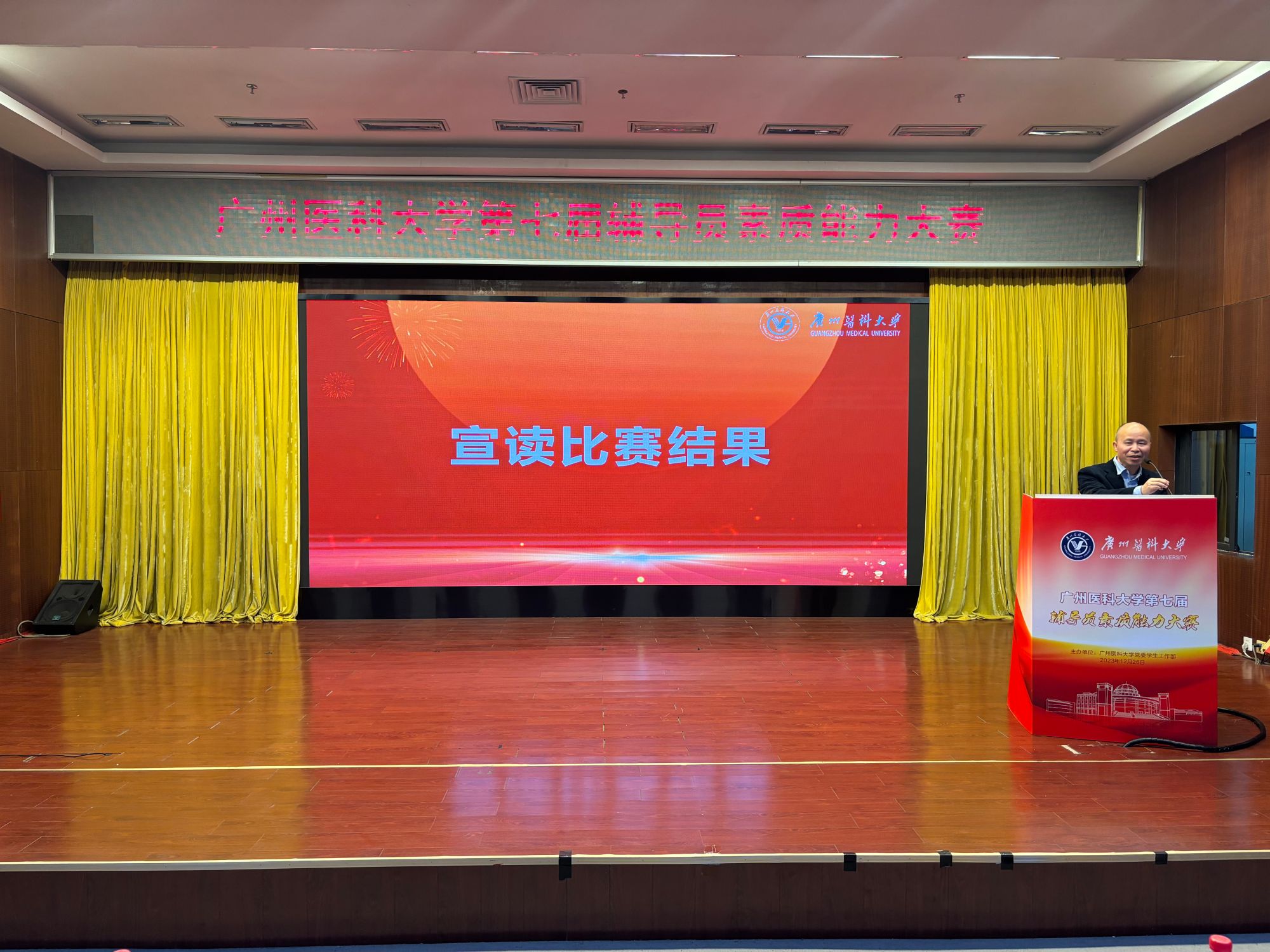 本网讯 12月26日下午,广州医科大学第七届辅导员素质能力大赛(决赛)在番禺校区举行。初赛晋级的8名辅导员在决赛上同台竞技,最终,第三临床学院辅导员郑伟训荣获大赛一等奖。