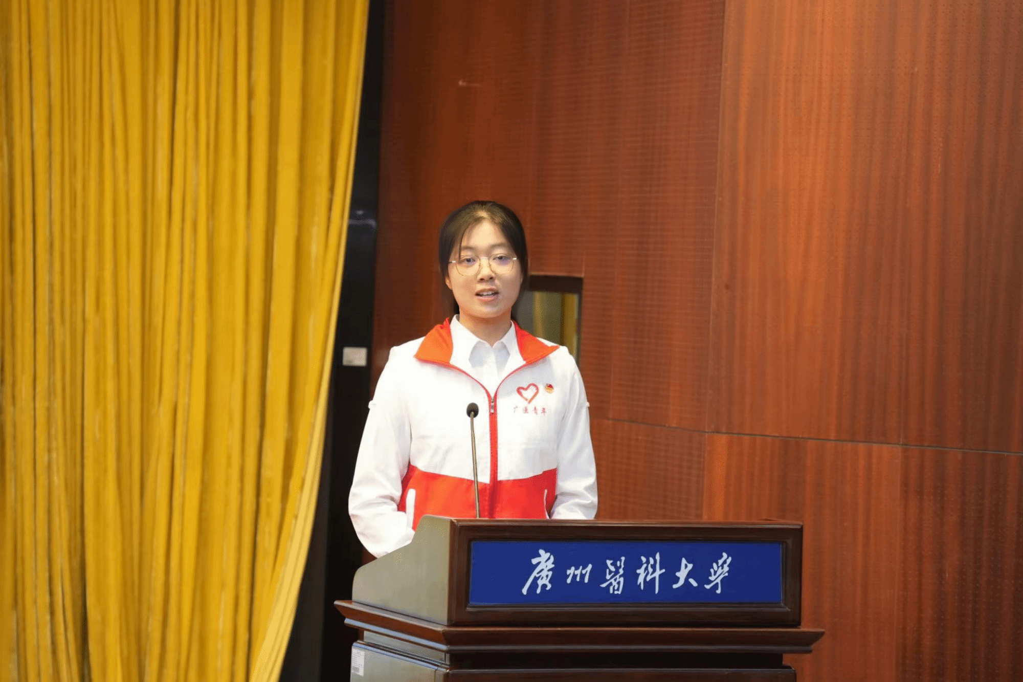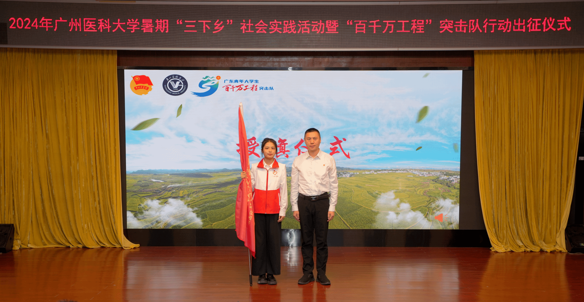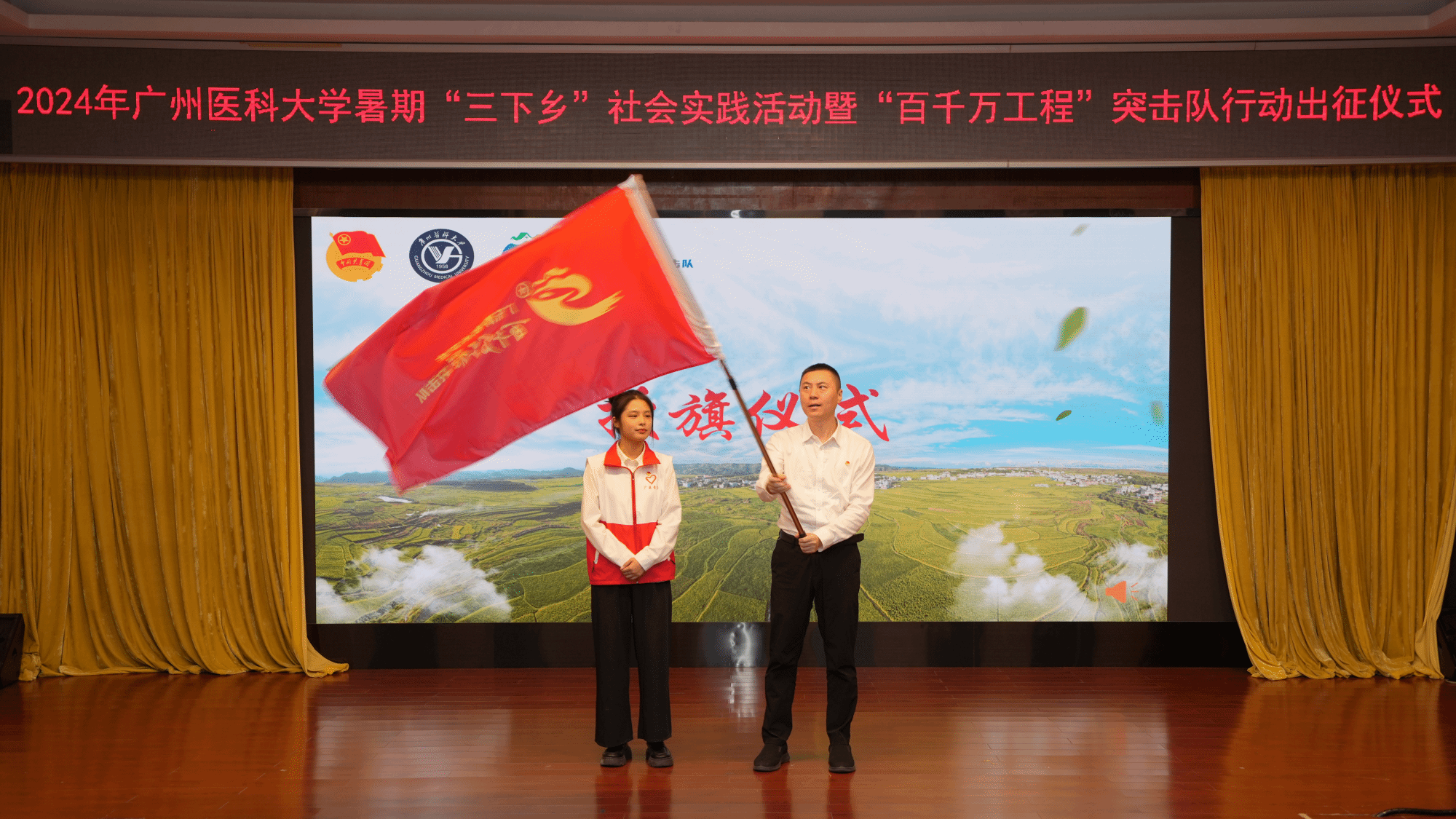 会议最后,团广东省委副书记范春为2024年广州医科大学“百千万工程”突击队行动学生代表吴依然同学授旗。