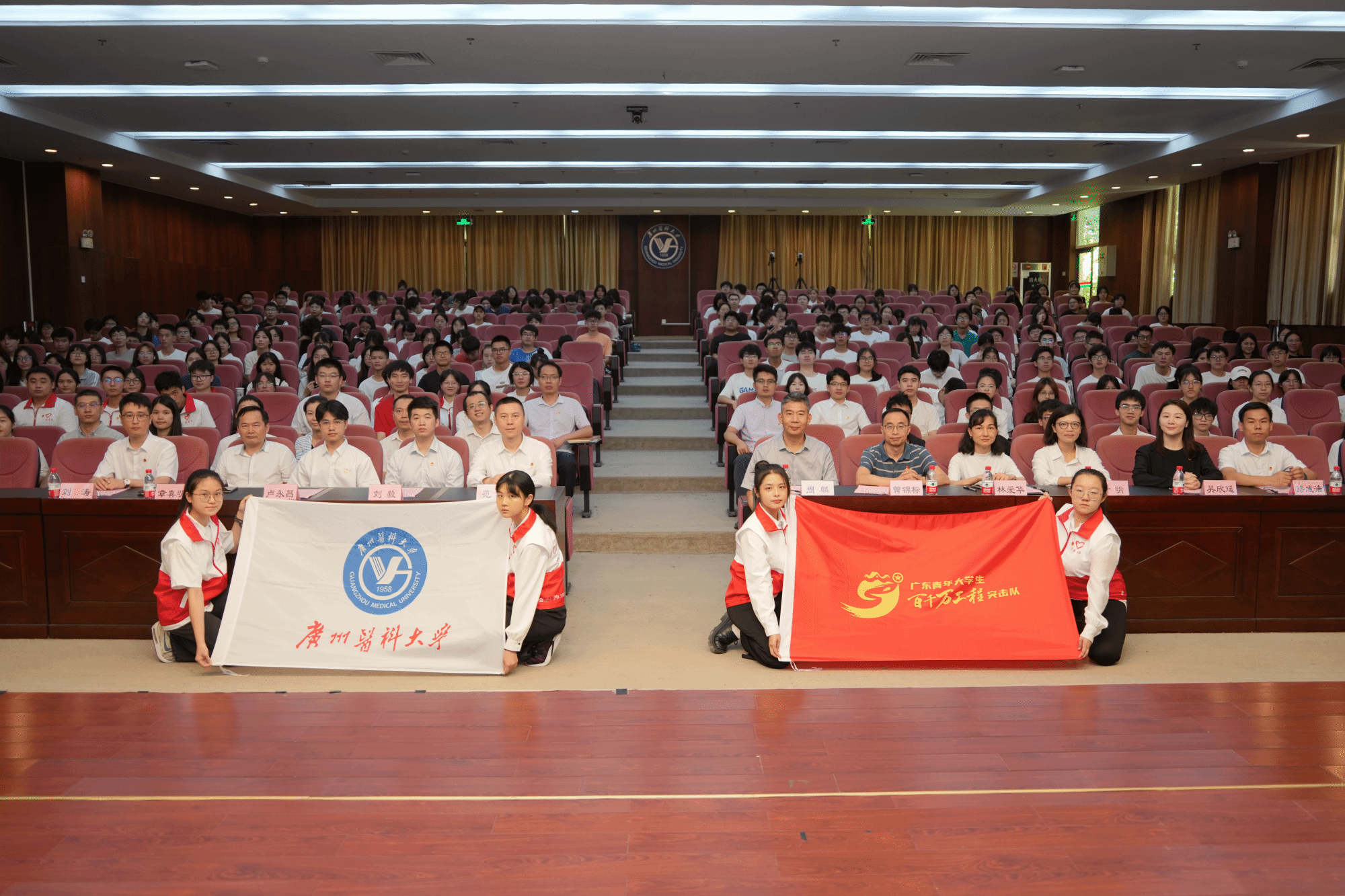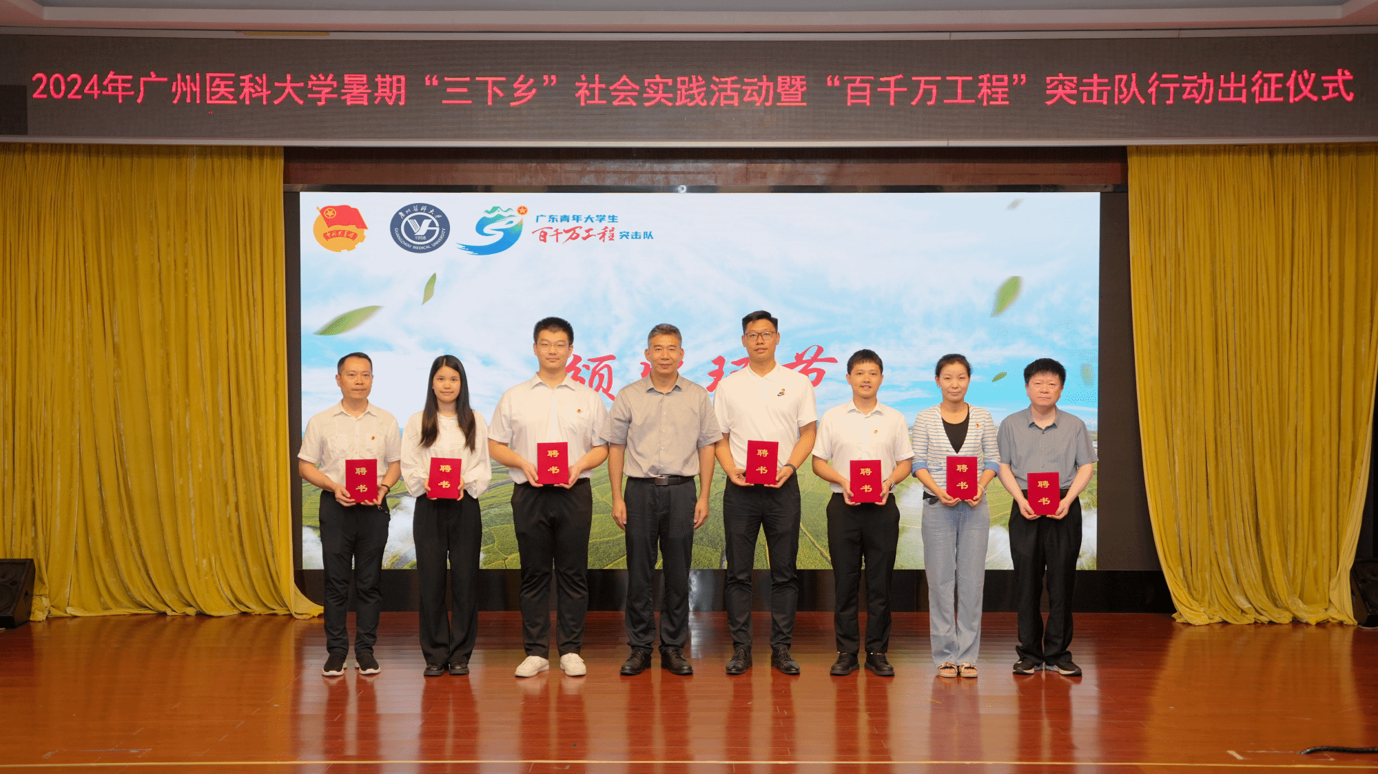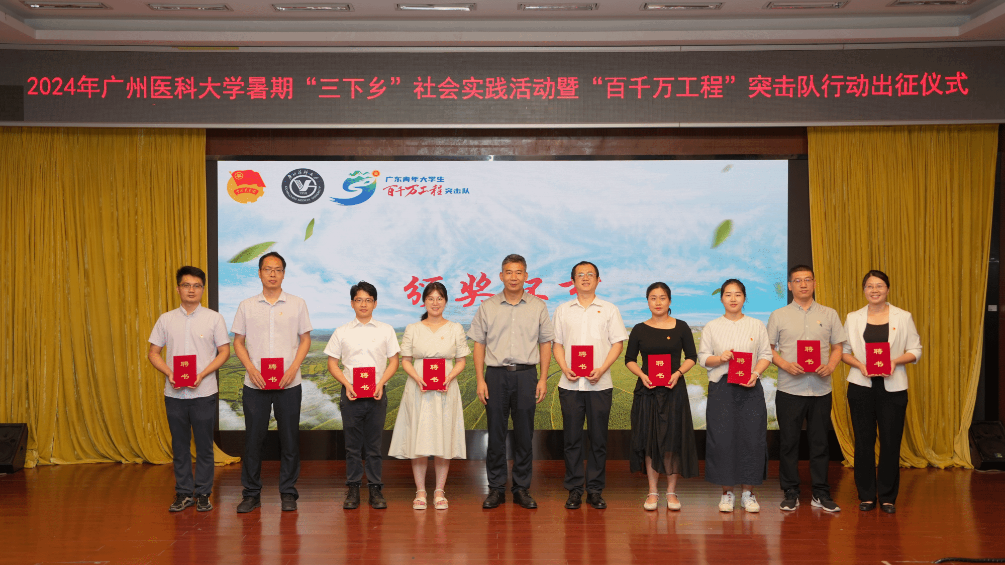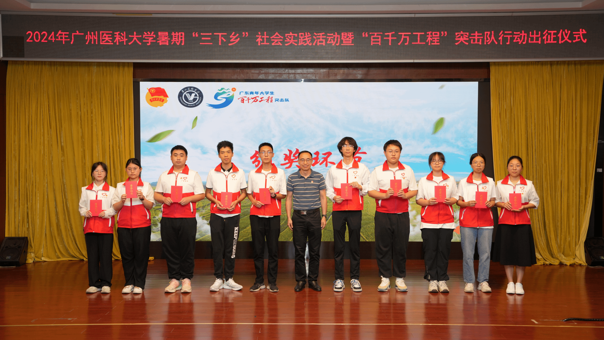 本网讯 7月5日,2024年广州医科大学暑期“三下乡”社会实践活动暨“百千万工程”突击队行动出征仪式在番禺校区举行。