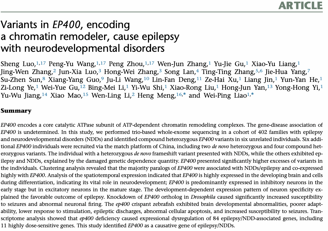 本网讯 近日,由广州医科大学廖卫平教授领衔的中国癫痫基因1.0项目在期刊The American Journal of Human Genetics发表了最新研究成果Variants in the EP400 gene, encoding a chromatin remodeler, cause epilepsy with neurodevelopmental disorders。该研究发现了新的癫痫和神经发育障碍致病基因EP400。该研究同时展示了医学遗传学领域最新理论,即基因依赖学说,揭示了基因依赖特性决定表型严重程度和预后关键机制,在医学遗传学理论上取得新进展。
