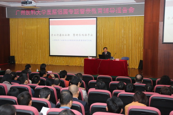 广医在线讯 为进一步加强学校党风廉政建设,加大反腐倡廉教育力度,加强对干部职工的法律法规教育和党纪政纪教育,增强教职工廉洁从政、从教、从医的意识,营造风清气正的校园环境,12月9日上午,我校特邀番禺区检察院反贪局副局长李伟章来校作反腐倡廉专题警示教育辅导报告。学校领导,校本部全体中层干部及各党总支支委,机关总支、后勤总支的全体党员,各直属医院领导班子成员及相关管理部门负责人共200余人聆听报告。学校纪委书记陈杰主持报告会。