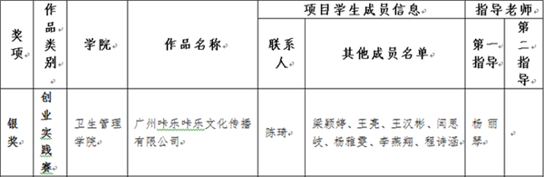 广医在线讯 5月25日至27日,由团省委、省教育厅、省人社厅、省科技厅、省科协、省学联等单位主办得"挑战杯?创青春广东大学生创业大赛"终审决赛在华南理工大学五山校区举行。由校团委推荐的8支参赛团队获奖,其中卫生管理学院杨丽琴老师指导的“广州咔乐咔乐文化传播有限公司”获得银奖。