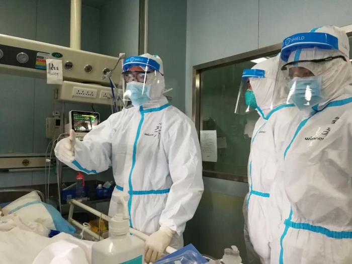 桑岭(左一)在金银潭医院ICU救治危重症患者