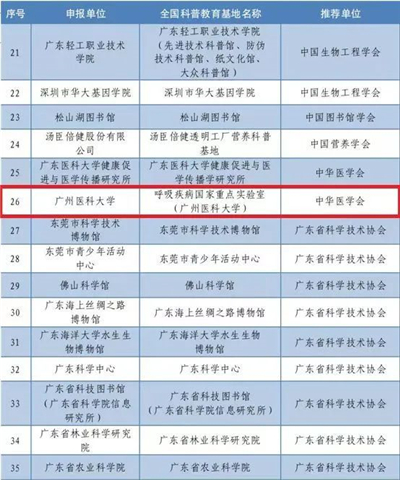 广医在线讯 日前,中国科协公布2021—2025年第一批全国科普教育基地名单,呼吸疾病国家重点实验室(广州医科大学)等800个单位入选其中。