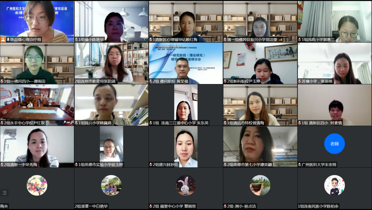 11月21日上午,培训班开班仪式在线上召开,学校副校长李建华、附属脑科医院专职党委副书记杨婵娟、精神卫生学院副院长周亮、教师教学发展中心办公室主任许松青,清远市教育局德育安全科科长张伟滔、副科长吴小碧,教育局创文办副主任杨海莹出席了开班仪式。开班仪式由学校教务处副处长张慧群主持。