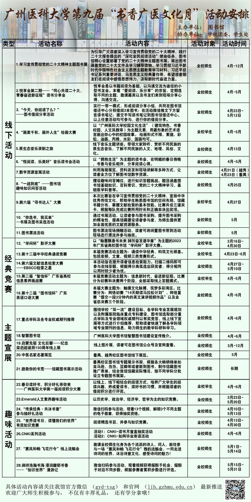 袁林馆长介绍了“书香广医文化月”的活动安排:两校区图书馆共7个部门将联合学生处、团委等相关部门及供应商陆续开展“悦阅读,乐美好”音乐分享会、“画里千秋,画外人生”绘画大赛、“一战到底”图书馆趣味知识问答、“学问杯”影评大赛、“惠风和畅、飞花行令”线上流觞会、“你选书,我买单”精品图书采选活动等近三十项趣味推广活动,让大家在轻松愉悦的氛围下尽情感受阅读的乐趣和魅力。