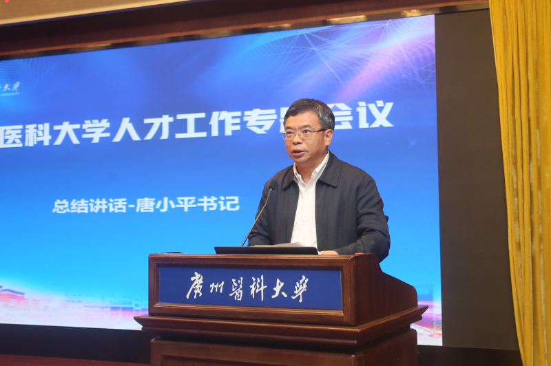 本网讯 4月28日,广州医科大学人才工作专题会议在番禺校区召开。学校党委书记唐小平主持会议并作总结讲话,校长赵醒村作学校人才工作报告,中国科学院广州生物医药与健康研究院人事教育处处长古京分享人才工作经验。