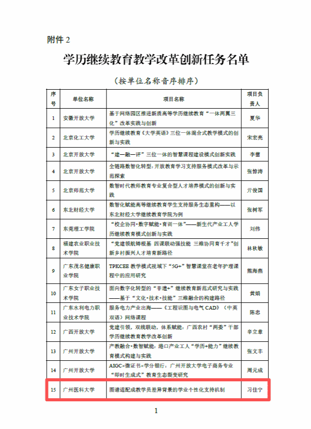 根据教育部公示的“第三批高等继续教育领域学习型社会建设重点任务名单”,我校生物医学工程学院习佳宁副教授负责的《图谱适配成教学员差异背景的学业个性化支持机制》项目,入围“学历继续教育教学改革创新任务”培育名单。