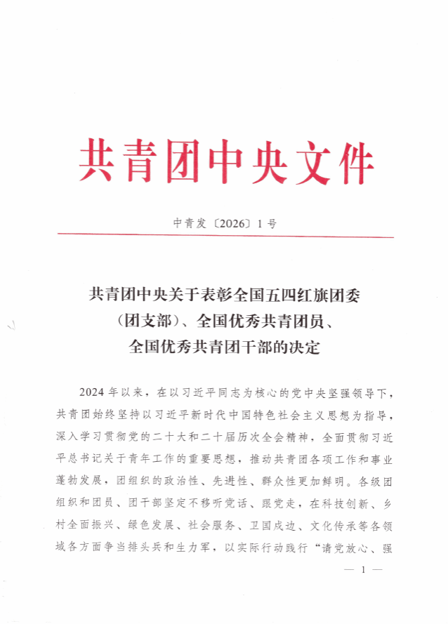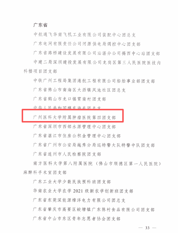近日,共青团中央发布关于表彰全国五四红旗团委(团支部)、全国优秀共青团员、全国优秀共青团干部的决定,授予342个团组织全国五四红旗团支部称号,该项荣誉是团中央授予基层团组织的团内最高荣誉。其中,我校附属肿瘤医院第四团支部(原外科第二团支部)获评全国五四红旗团支部。