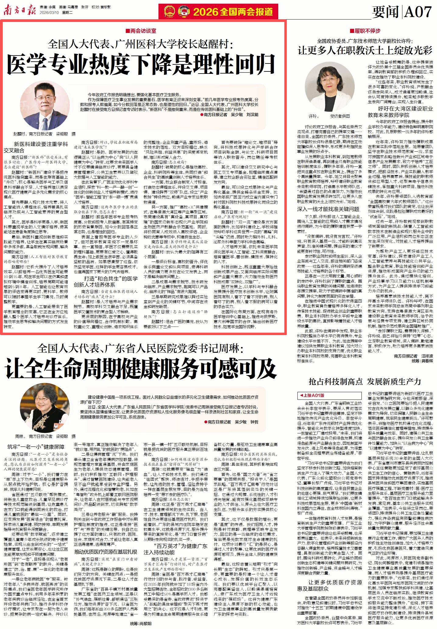 题为《医学专业热度下降是理性回归》的专访刊发于2026年3月10日《南方日报》A07版。以下为全文:
