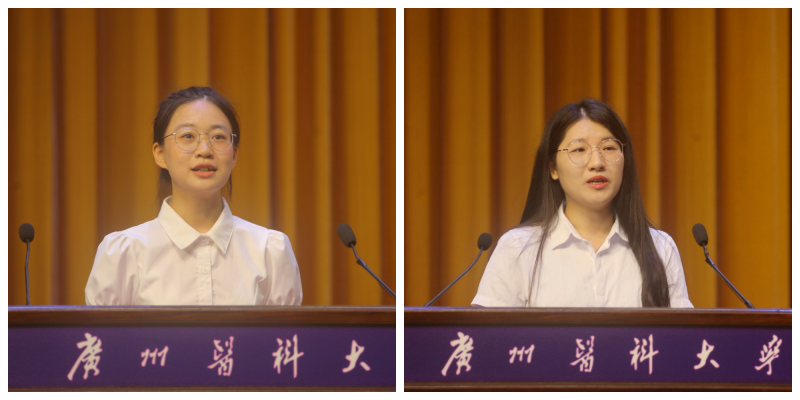 公共卫生学院食品卫生与营养学专业的彭嘉欣、内科学博士研究生周丹莎分别代表本科生新生、研究生新生发言。