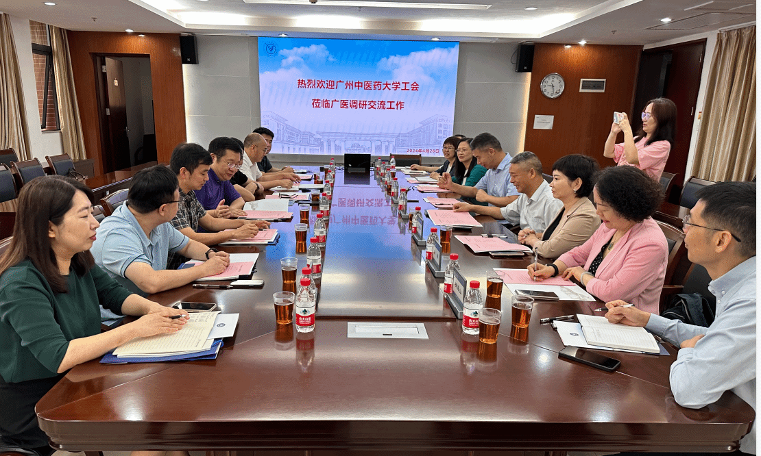 本网讯 4月26日上午,广州中医药大学副校长、工会主席郭鸿,常务副主席郝宏伟等一行到我校调研工会工作。广州医科大学副校长、工会主席周麟,相关部门、学院负责人参加交流。