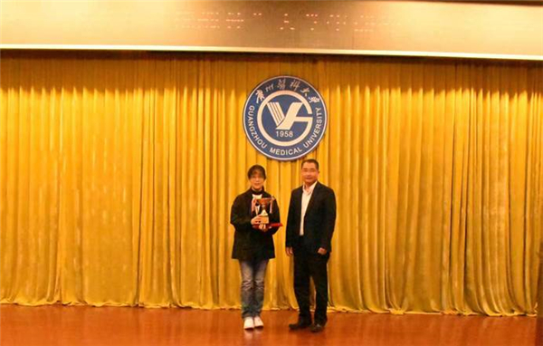 学校党委陈晓辉副书记为第一临床学院团委段慧菡老师颁发“挑战杯”奖杯。
