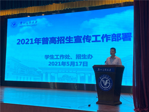 广医在线讯 5月17日,学校召开2021年普高招生宣传动员暨工作部署会议,副校长赵醒村,学生工作处(招生办)、宣传部、教务处、现代教育与信息中心、团委等部门和各学院主管招生工作的负责人、本科招生专业负责人,全体辅导员,学生工作处(招生办)相关人员参加会议。学生工作处处长、招生办主任陈伟民主持会议。