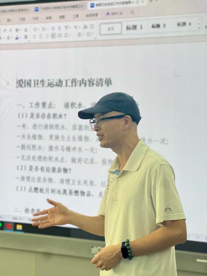 学校预防保健科科长陈观权就“两热”疫情防控进行了系统的知识普及与技能培训。他聚焦“学院如何有效开展爱国卫生运动”这一核心议题,详细讲解了科学灭蚊的技术要点。