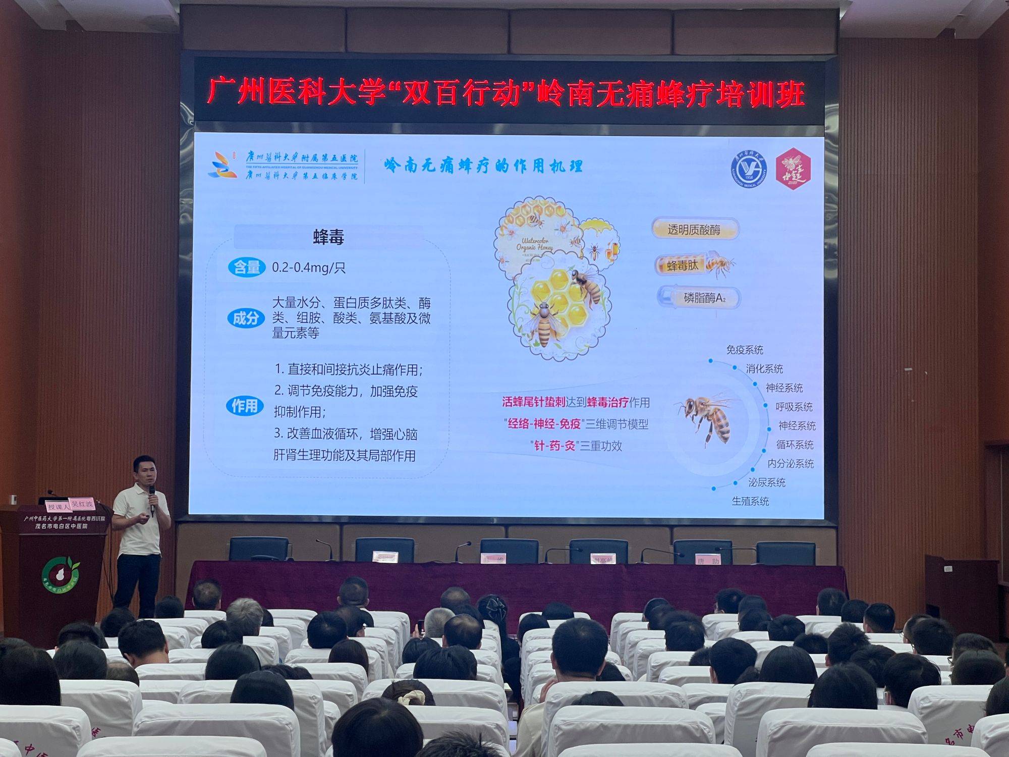 8月22日,广医附属第五医院主治中医师、非物质文化遗产——岭南无痛蜂疗传承人、“蜂生水起”团队负责人吴红波在电白区中医院举行了岭南无痛蜂疗技术的示范和适宜技术展示推广活动。授课现场,电白区区属各医院针灸科和康复科工作者、镇卫生院基层医疗工作者代表及电白区蜂农等共计70多人参加此次活动,电白区中医院副院长唐助参加开班仪式,活动由李树学队长主持。