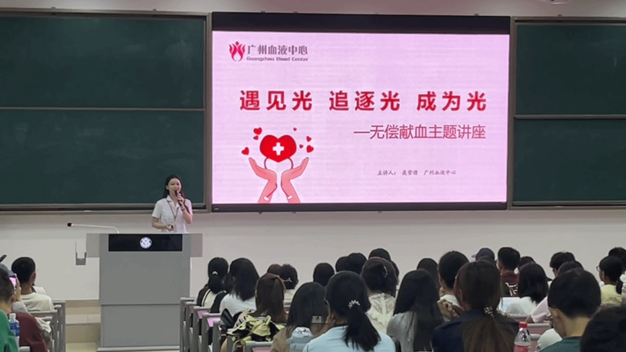在进行无偿献血前,广州血液中心的工作人员开展主题为“遇见光 追逐光 成为光”的无偿献血讲座,生动讲解了无偿献血在临床医疗中不可替代的作用,并介绍了献血相关注意事项。