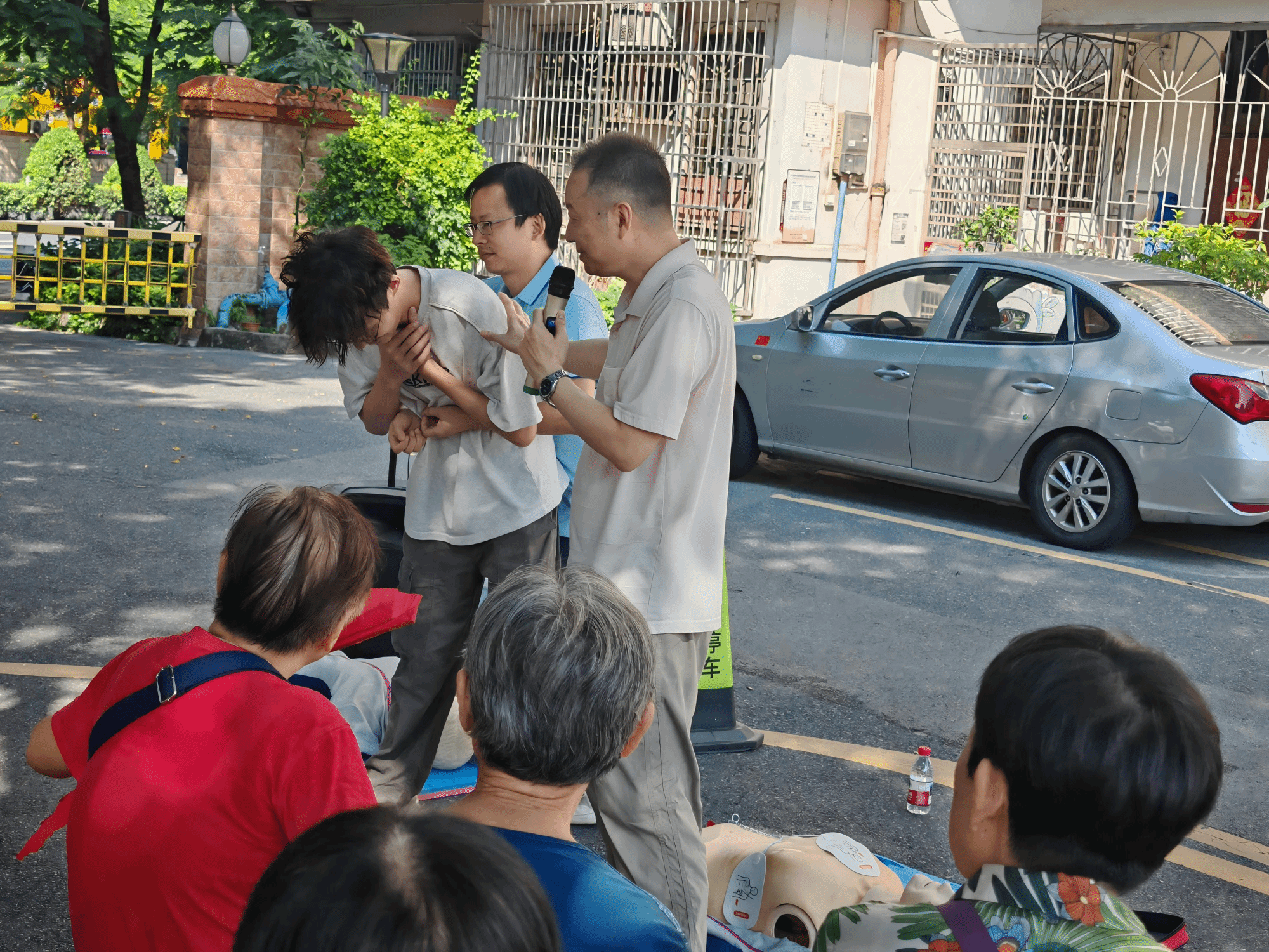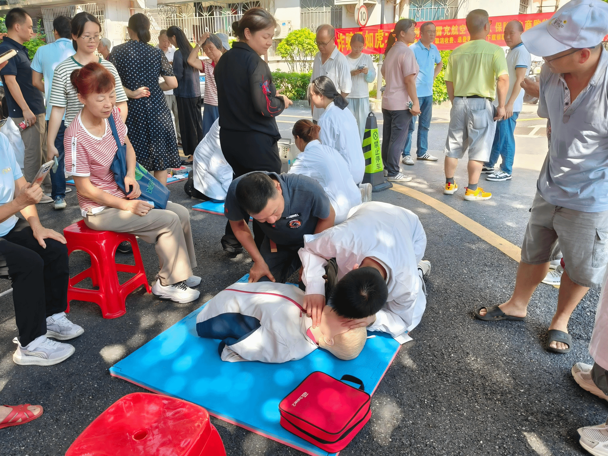 附属第一医院急诊科张作鹏主任受邀主讲急救知识,他为居民们详细阐释了心肺复苏的重要性、操作步骤以及注意事项,介绍了体外自动除颤仪(AED)的使用方法,还讲解了止血包扎、骨折的应急处理、海姆立克急救法等日常生活中常见突发疾病和意外伤害的现场救护措施。他采用理论宣讲与实际操作相结合的方式,借助模拟人现场生动演示了急救场景以及心肺复苏的每个动作细节,同时展示了不同部位受伤的止血方法和包扎技巧。