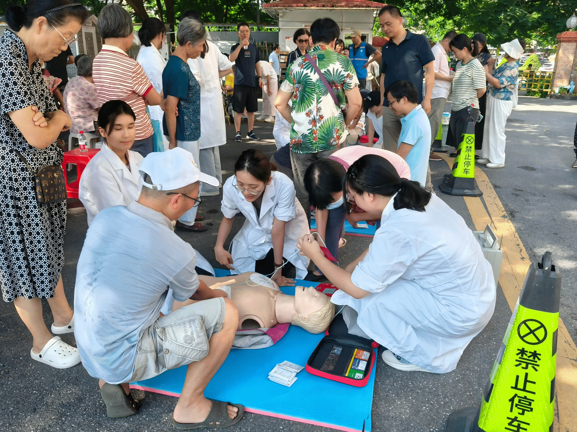 在活动现场,医学模拟教育中心扶悦老师带领学生志愿者,与学校关工委老同志、退休医疗专家、离退处工作人员以及社区工作人员共同组成的志愿服务团引导居民参与急救知识的学习与实操体验,协助医疗专家进行急救演示,一对一、手把手地指导居民进行心肺复苏及除颤仪使用实操练习,耐心解答居民提出的疑问,助力大家掌握关键的急救技能。