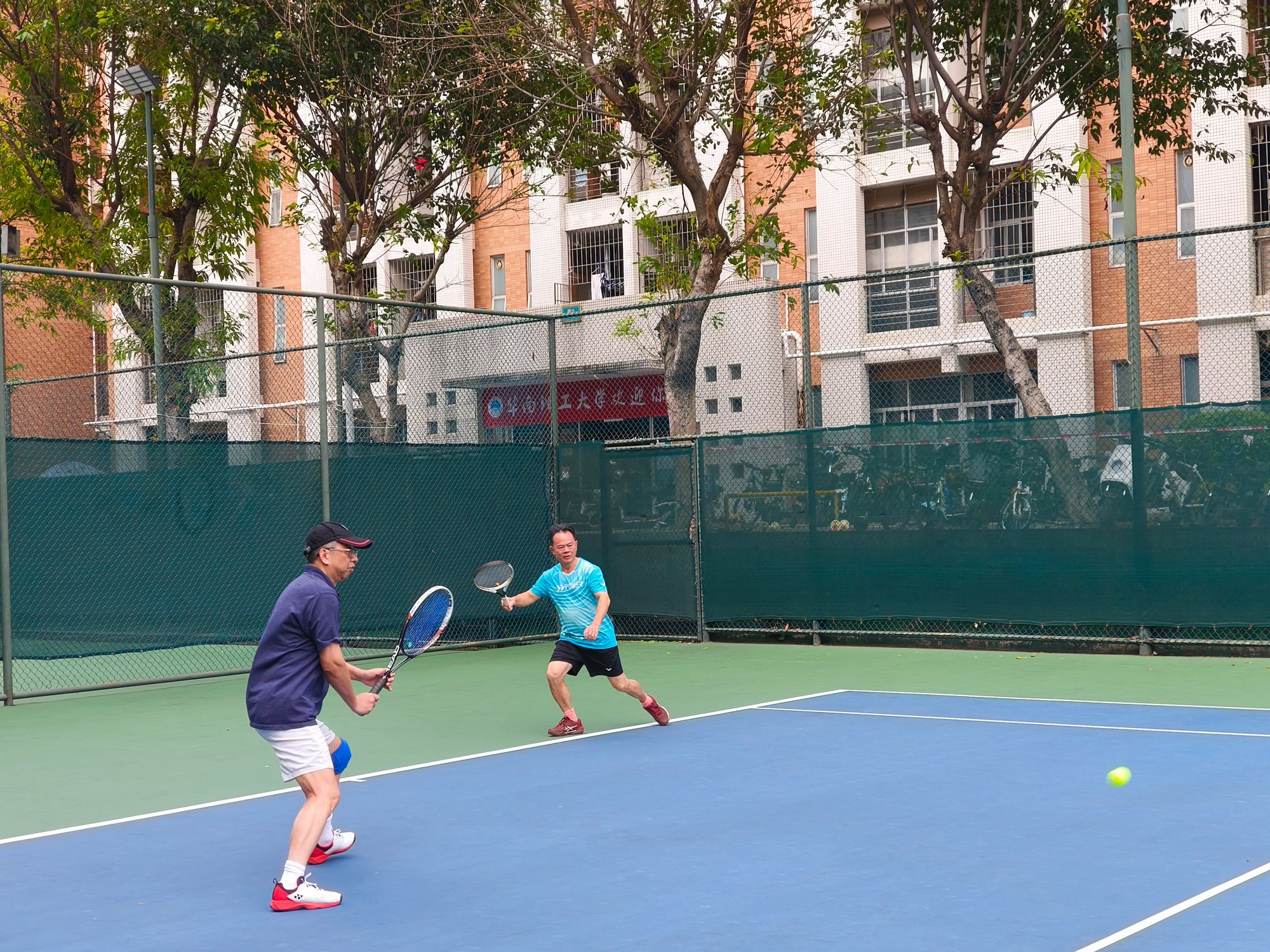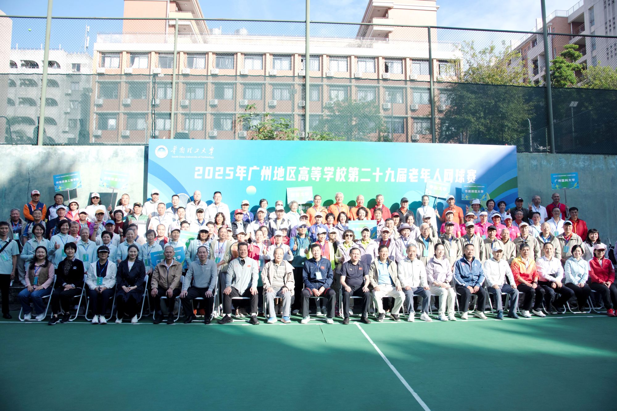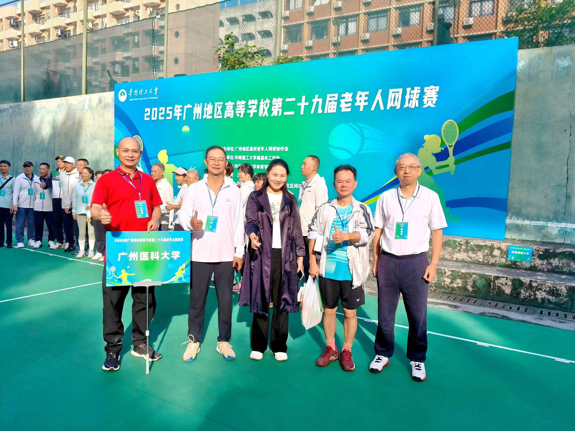 11月15日上午,2025年广州地区高等学校第二十九届老年人网球赛在华南理工大学举行。学校离退处积极动员,组织我校退休网球爱好者参与男子丙组网球双打项目。