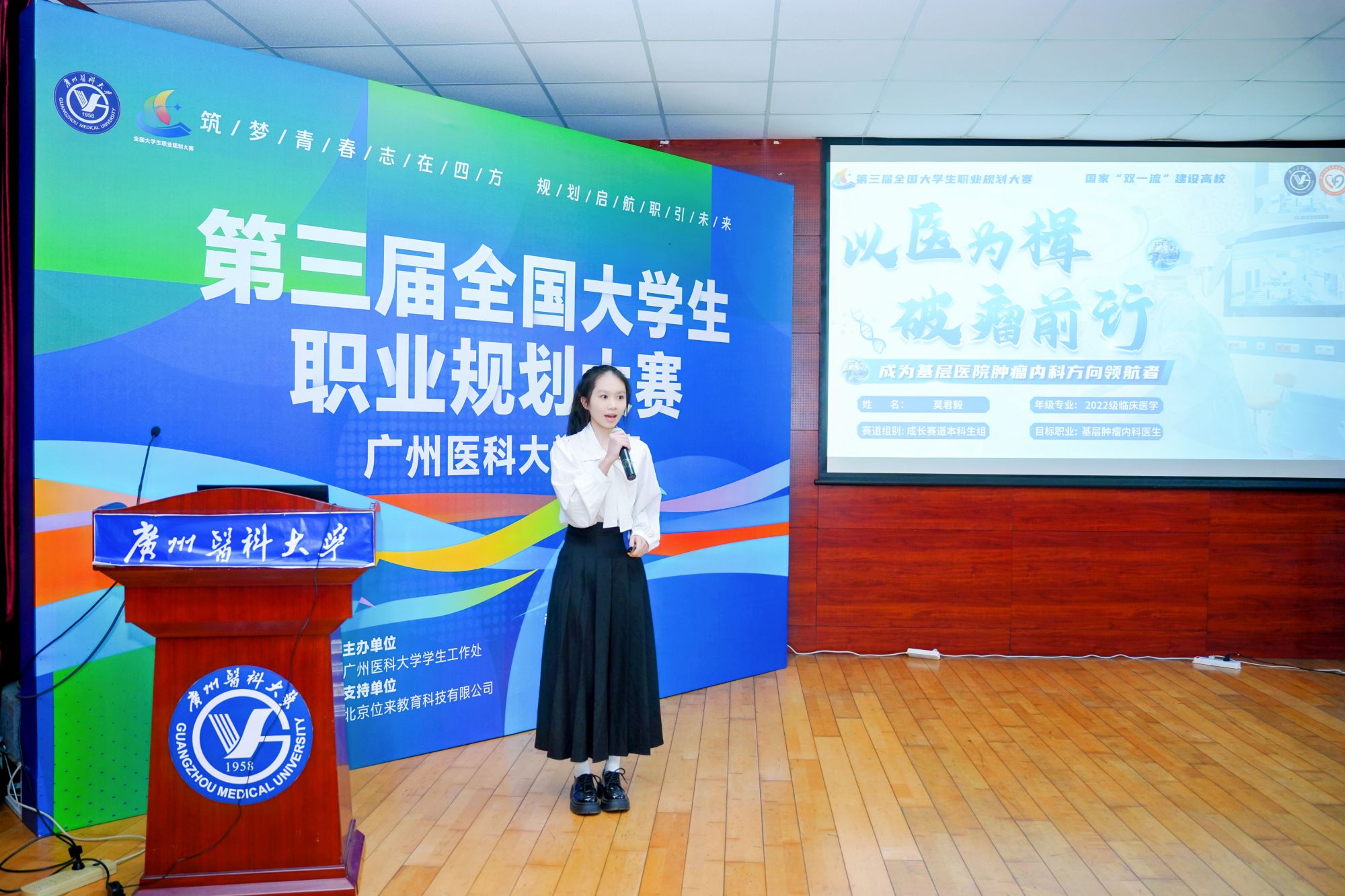 11月29日上午,第三届全国大学生职业规划大赛广州医科大学决赛在番禺校区举行。比赛分为就业赛道和成长赛道,分别在图书馆学术报告厅和教工活动中心举行校赛决赛。两个赛道分别评选出一等奖、二等奖、三等奖,其中,2024级医学影像学本科生彭嘉欣获成长赛道一等奖,2021级临床医学本科生宗祝吟君获就业赛道本科生组一等奖,2023级护理硕士生黄健勤获就业赛道研究生组一等奖。
