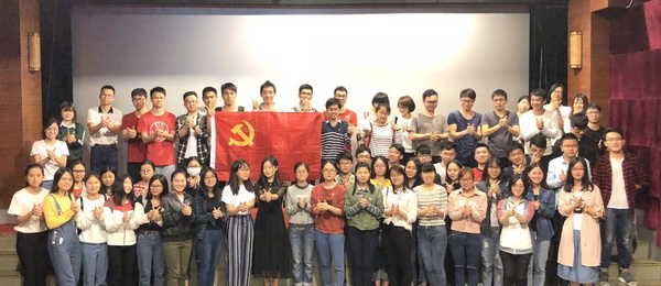 观影前,同学们在鲜红的党旗下,全体党员佩戴党徽,举起右手,握紧拳头,经过重温入党誓词行动。