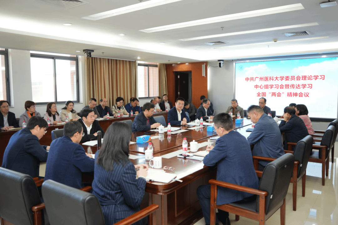 他强调,学习贯彻全国两会精神是当前一项重大政治任务。学校党委要深入学习贯彻习近平总书记重要讲话精神和全国两会精神,把习近平总书记在全国两会期间重要讲话精神同在中央经济工作会议上的重要讲话精神、在中央政治局会议讨论政府工作报告时的重要讲话精神和对广东广州系列重要讲话重要指示精神一体学习贯彻,自觉扛起责任,扎实推进教育、科技、人才“三位一体”协同融合发展的广医实践。一要坚持聚天下英才而用之,服务发展新质生产力,深化医教融合、产教融合、科教融合、医工融合,以最优秀的人培养更多优秀的人。二要坚持加快原创性科技创新,推动产学研一体化,通过科技赋能推动医疗卫生事业发展,以创新成果造福人民。三要坚持党建引领,深化内部改革,扩大开放办学,以干字当头、实字托底,形成推动发展强大合力,做好“引进来”和“走出去”两篇大文章,把广州医科大学“双一流”建设高质量发展的美好图景变为生动现实。