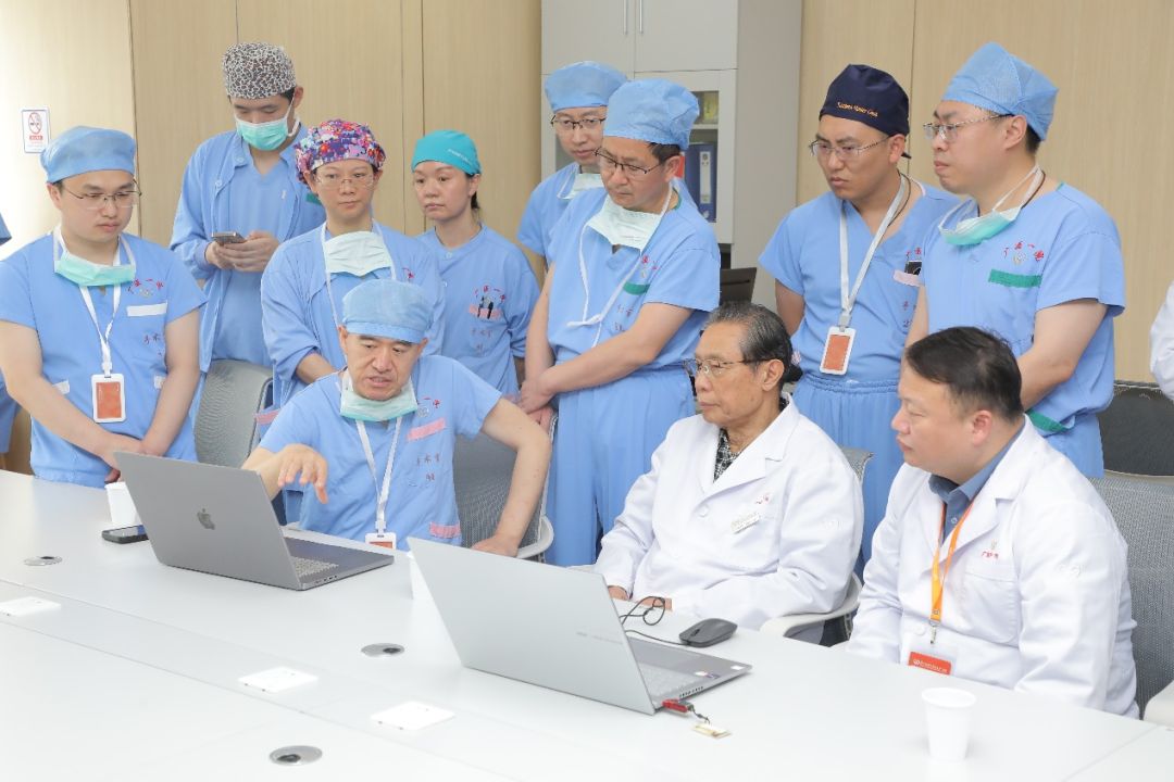 钟南山院士也来到麻醉手术科办公室,了解手术开展情况以及后续应该注意的问题,得知一切顺利之后,对于这次京广两地多学科团队携手,成功救治如此疑难复杂的罕见病表示肯定。