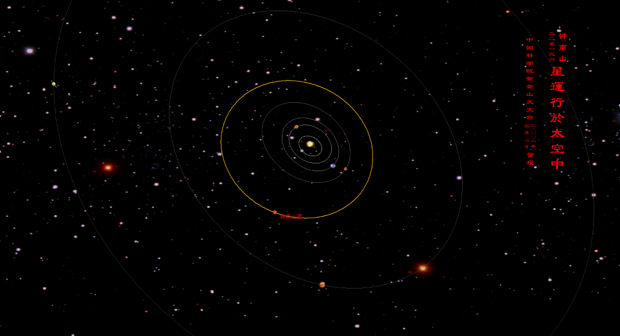 “钟南山星”的轨道偏心率为0.199,轨道倾角为13.159度,轨道半长径为2.541天文单位。该星到太阳的平均距离为3.73亿公里,绕太阳一周需4.05年。“钟南山星”在轨道上以每日158万公里的高速奔腾前进,相当于每秒18.3公里的速度在绕日运行,由于距地球有数亿公里,因此从地面上看上去,她在星空中缓慢地移动。“钟南山星”与地球的最远距离达6.05亿公里,最近时只有1.55亿公里。