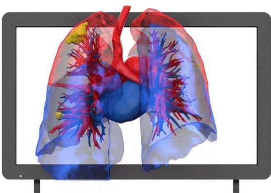 最为突出的是在这里的三维重建,是通过多人多视点裸眼3D显示,可以实现无痛无创便能够精准定位肺结节大小、形状、位置及与支气管、动脉及静脉的立体关系,让术者通过3D视野,一目了然看到病灶位置,从而进行手术范围的划定,做到既能够实现根除效果,又能够最大程度上保留肺组织,即使长在刁钻位置的肺结节也能够被“揪出来”,避免整个肺叶切除的创伤。