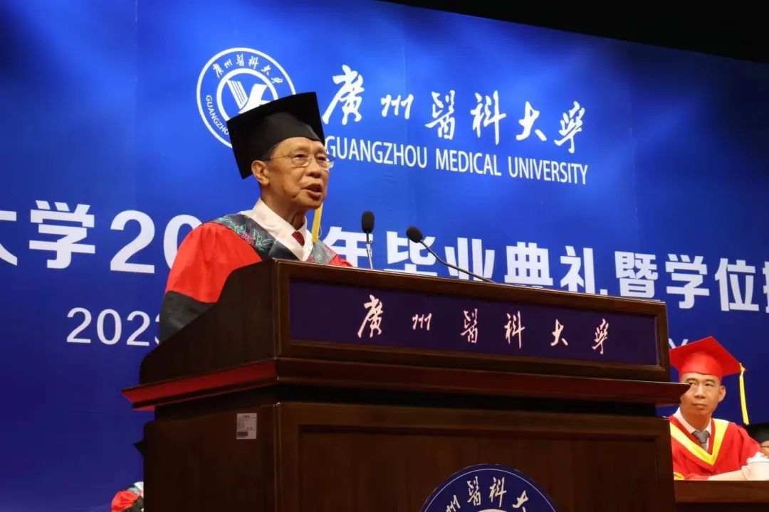6月26日,广州医科大学举行2023年毕业典礼暨学位授予仪式。毕业典礼上,“共和国勋章”获得者、中国工程院院士、老校长钟南山发表讲话。同学们的朝气和阳光使得钟南山院士回想起63年前,他毕业的时候,由于条件的艰苦没有毕业典礼,但现在,每一次他看到同学们毕业时朝气蓬勃的状态都很有感触。