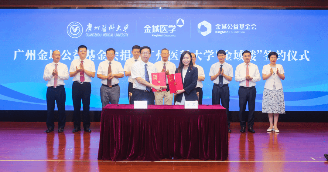 为支持广州医科大学(以下简称“广医”)“双一流”建设,推进“新医科”专业建设与布局,广州金域医学检验集团(以下简称“金域医学”)向广医捐资人民币1亿元,用于建设“金域楼”和推动教学科研工作,助力高水平医检人才培养和产学研融合发展。7月3日,双方战略合作签署暨“金域楼”捐建签约仪式在广医番禺校区举行。
