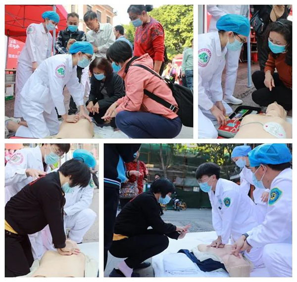 急救团队为市民进行急救科普宣教,现场教授心肺复苏、除颤器AED使用等急救技能,并邀请市民亲自体验,市民直呼“活动很有意义,学到了”。