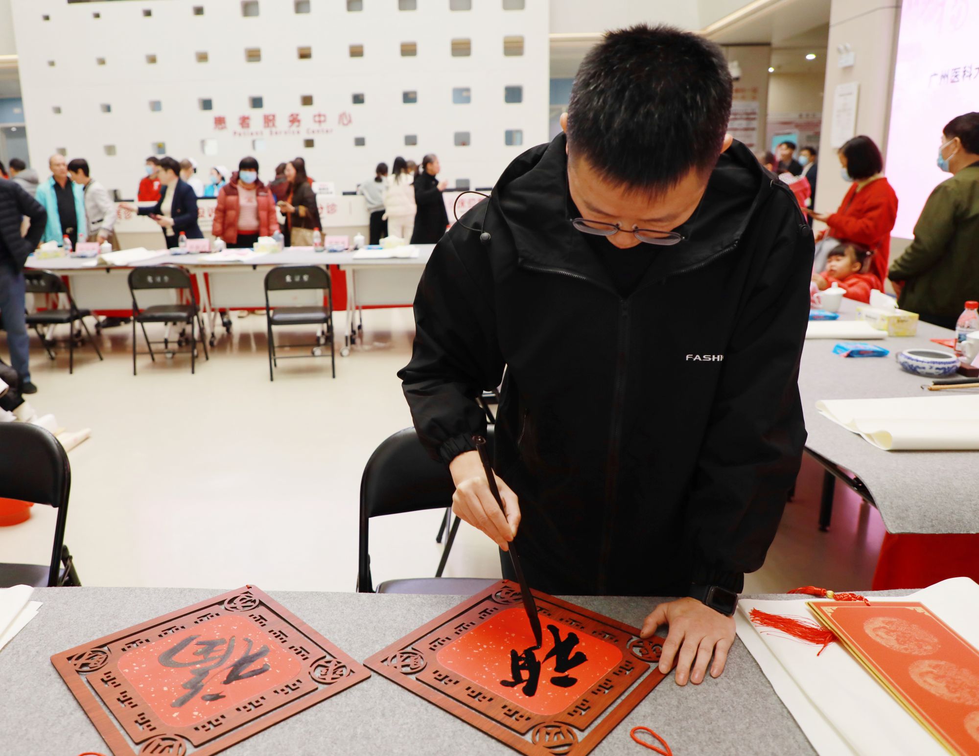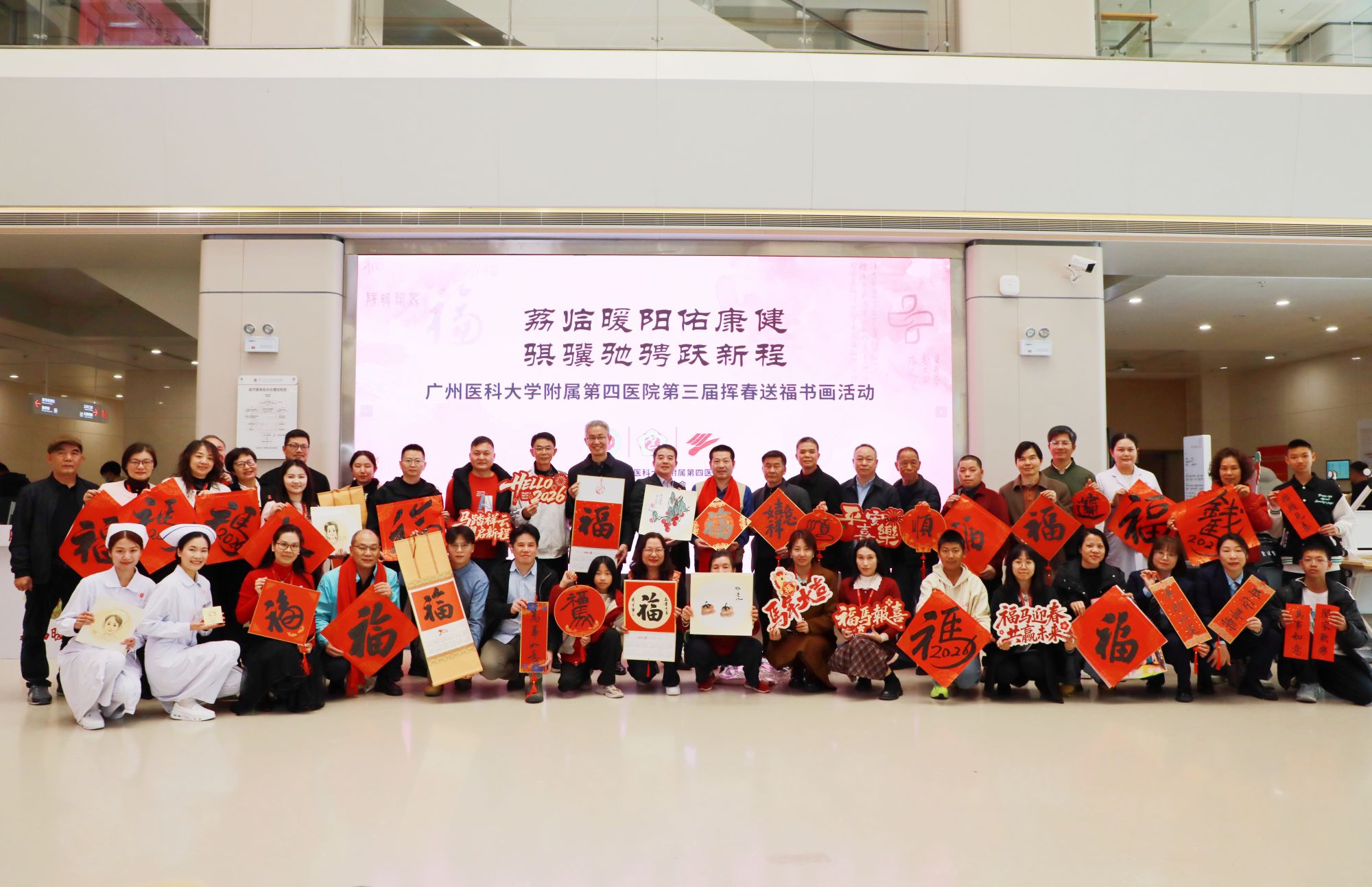 墨香迎岁,福暖医心。2月4日,广医四院联合广州市书法家协会、广州青年美术家协会、广州市增城区文学艺术界联合会、广州市增城区书法家协会举办以“荔临暖阳佑康健·骐骥驰骋跃新程”为主题的第三届挥春送福书画活动。来自市区的15位书法家、国画、漫画、剪纸名家齐聚现场,近千名市民朋友热情参与,共赴一场墨香与匠心交融的新春文化盛宴。活动由广医四院党委副书记尹传忠主持。