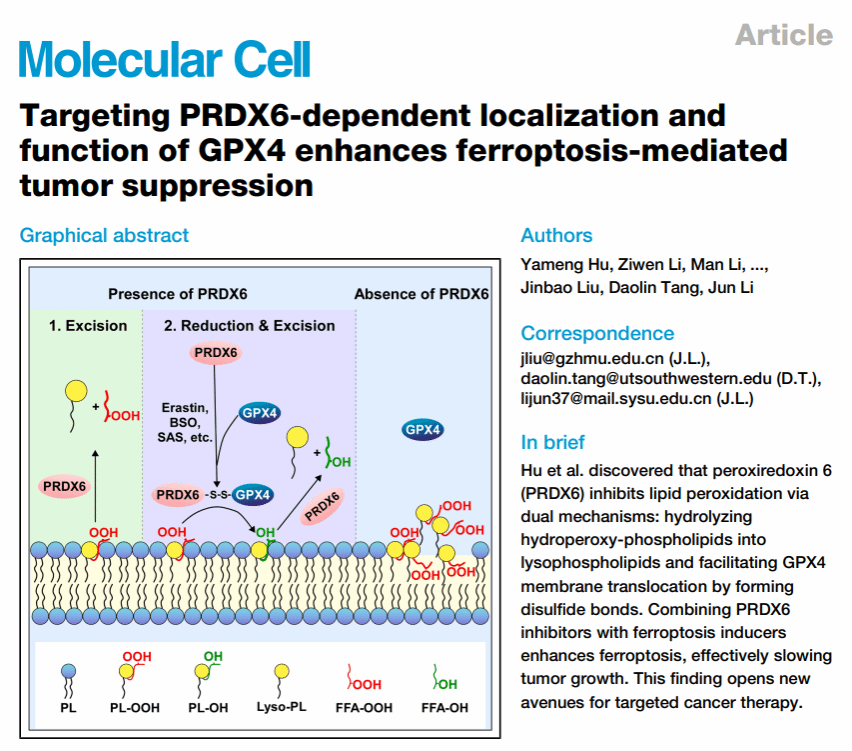 12月18日,广州医科大学基础医学院刘金保教授联合中山大学中山医学院李隽教授、美国德克萨斯大学唐道林教授团队,在《细胞》(Cell)旗下具有较高影响力的子刊Molecular Cell(IF:16.6)上发表了题为Targeting PRDX6-dependent localization and function of GPX4 enhances ferroptosis-mediated tumor suppression的研究成果。该研究系统揭示了过氧化还原酶6(PRDX6)介导的铁死亡防御机制,阐明了其结合并招募谷胱甘肽过氧化物酶4(GPX4)细胞膜转位,协同修复磷脂膜过氧化损伤,帮助肿瘤细胞逃逸铁死亡的分子机制,为靶向癌症治疗提供了新思路。
