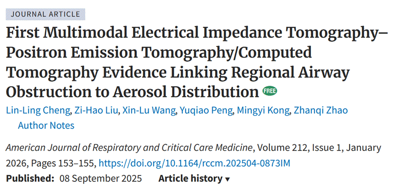 近日,生物医学工程学院联合附属第一医院广州呼吸健康研究院、呼吸疾病全国重点实验室完成的题为《首次连接局部气道阻塞与气溶胶分布的多模态EIT-PET/CT证据》的原创研究成果,被国际呼吸领域顶级期刊《美国呼吸与重症监护医学杂志》(American Journal of Respiratory and Critical Care Medicine, AJRCCM,影响因子19.4)正式遴选为2026年1月刊封面文章。该论文已于2025年9月在线发表,生物医学工程学院招展奇教授为论文通讯作者。